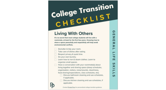 Download the Complete Set of College Transitions ChecklistsIf you’re a college-bound senior, we know it can be overwhelming to think about all the changes and challenges that come with this exciting new chapter of your life. Even if you feel utterly prepared for the tougher course content that comes along with a college workload, are you also prepared for independence? Do you know how to do laundry without wrecking your clothes? Can you manage your money? Can you make two reasonably healthy meals on your own?
